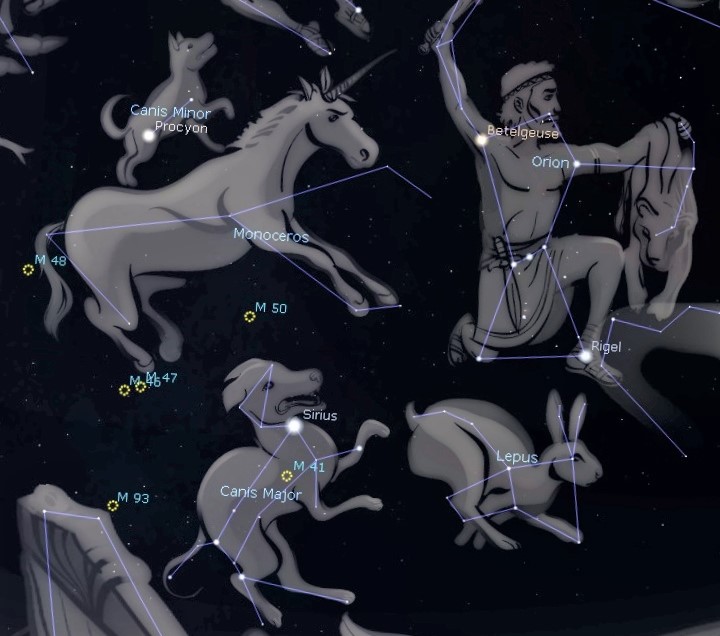To the lower left of the Belt is the night sky’s brightest star, Sirius, in Canis Major, the larger of Orion’s two canine companions. Bellatrix and dim Meissa, marking Orion’s head, form an arrowhead with Betelgeuse at the tip, which points toward Procyon in two-star Canis Minor. Auriga and Gemini ride above Orion. Among these winter constellations are five of the ten brightest stars, with 12 more in the top fifty.