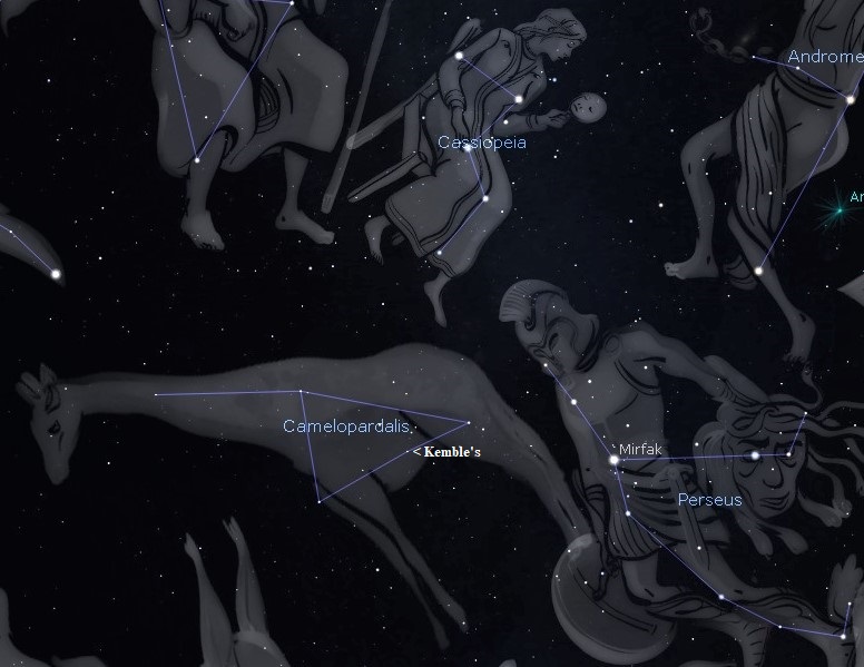 An interesting binocular object called Kemble’s Cascade is an observing highlight within Camelopardalis. This asterism, forming a line of about 20 stars, was noticed by Canadian amateur astronomer Father Lucien Kemble, who reported it to a columnist at Sky and Telescope magazine. One method of finding your way there is to imagine a line across the top stars of Cassiopeia’s W shape, right to left, and extend it an equal distance. Another is to extend an equal length line from Algol to Mirfak, the two brightest stars in Perseus. Near one end of this asterism a telescope will reveal the open star cluster NGC 1502, which is nicknamed the Jolly Roger Cluster.